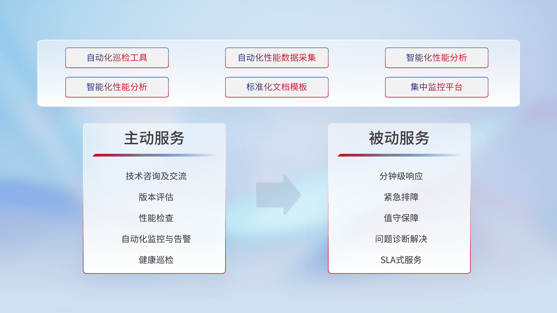 智能化工具和标准化文档,,保障服务质量,,提供主动服务(包含技术咨询、、版本评估、、性能检查、、、、自动化监控与告警、、、、健康巡检)和被动服务包含(分钟级响应、、、、紧急排障、、值守保障、、、、问题诊断解决、、、SLA服务)。。
